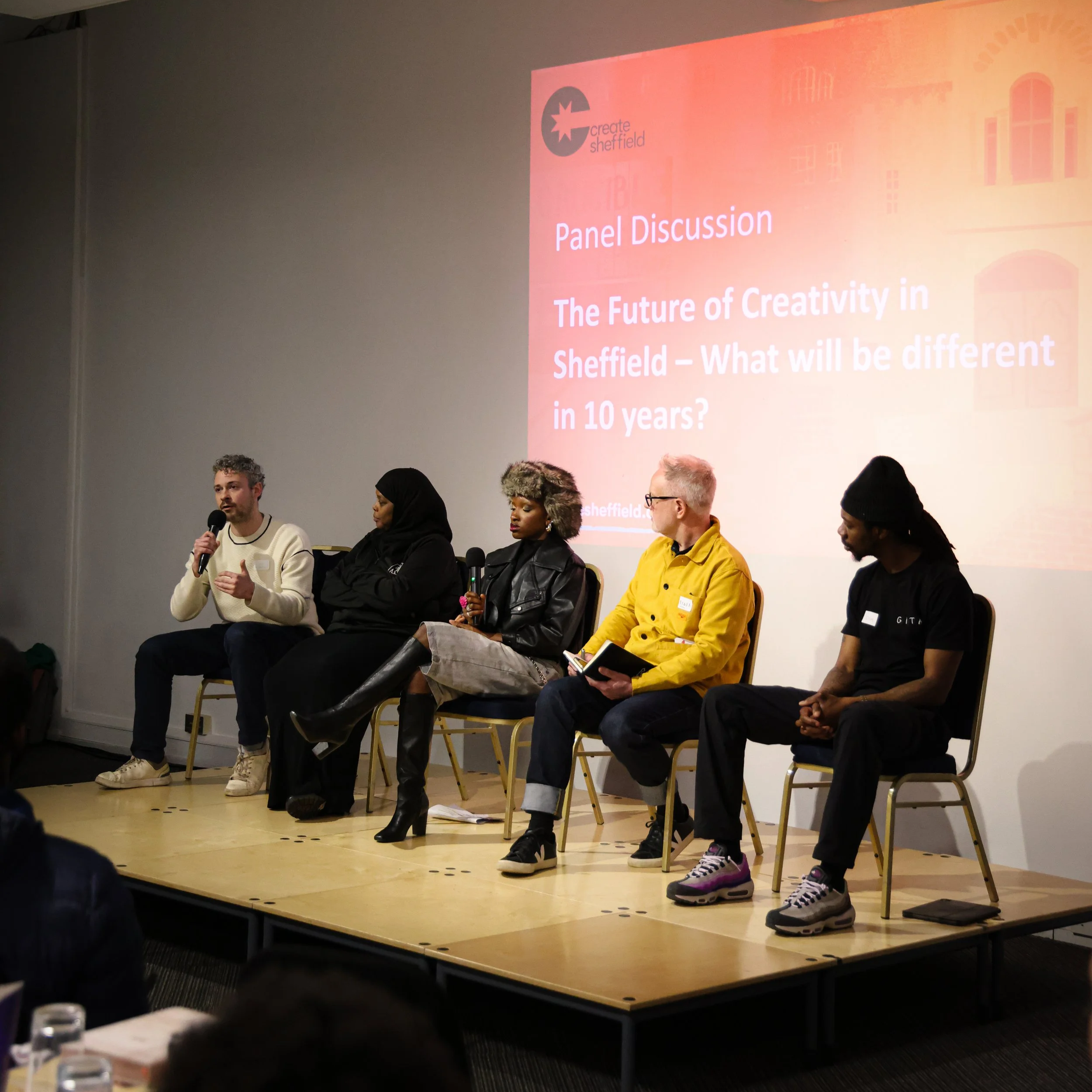 Left to right - Sam Holland (Migration Matters), Lord Mayor Safiya Saeed, Grace Walker (Freelance Creative), Roger Bateman (Creative Industries Institute, Sheffield Hallam) and Dom Hislop (Slambarz).